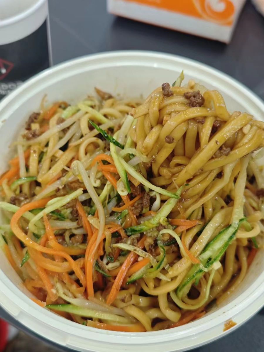 碗里堆得满当:胡萝卜丝橙得透亮,黄瓜丝泛着翠意,豆芽梗白芽黄,裹在面里像掺了半捧脆爽的风。酱汁裹得匀,每根面都沾着咸香的味儿,碎肉粒藏在缝隙里,咬开是油润的荤香。