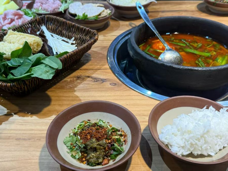 身前的陶碗里藏着惊喜,一碗是堆得蓬松的白米饭,颗粒分明泛着米香;另一碗则是灵魂蘸水,鲜红的辣椒面混着切碎的香菜,深褐色的腌菜卧在中间,油香与酸辣香缠在一起直钻鼻腔。背景里还摆着几碟鲜切肉片,粉粉的肌理看得人食指大动。这一桌酸辣鲜香的滋味,光是看着,就叫人忍不住拿起勺子,想先舀一勺酸汤唤醒味蕾。